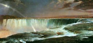Fittingly, as befits the bearer of Cole’s crown (“the great American landscape artist”), this painting is spatially complex. Its Panavision format (over twice as wide as high) immediately draws attention to the fact that the image in inscribed on a picture plane. The face of the Falls is seen frontally, and yet the top plane tilts down so that you also see it frontally. Church has cropped the foreground to remove any sense of dry land and to show only dark, swirling water (fabulously rendered—these Hudson River School painters really knew their water); the spectator might very well not be viewing the scene from safety, but about to go over the edge at any moment. The somber sky sounds an ominous chord with the dark green water; the only relief is the high note of the rainbow. The painting is terrifically successful at describing the actual sensation of the Falls themselves, conveying the sheer superhuman power and grandeur of the rushing water.