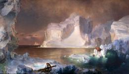 This arctic scene (not entirely imagined, as Church had taken a recent cruise into northern waters) is the very image of desolation. On the great floating hulks of ice are scattered a few tokens of human presence, but obviously everyone has come to a bad end. The ominous feeling is heightened by the yawning gap that opens between the foreground tower of ice and the rear ice-mountain, together forming a sort of bay of indeterminate size (the similarity of the forms in the near foreground and the far distance render the sense of the distance unstable; sometimes it looks close, and other times it seems quite far away.) The color scheme is equally unsettling, with the misty sky and the water rendered in warm colors, while the ice glows blue and green (the same green, come to think of it, that symbolizes the unstoppable power of Niagara.) Church has managed to reverse virtually all the normal color effects of landscape, with his warm sky and sea, his cool foreground and warm distance.