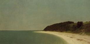 It is as bare as can be. The scimitar curve of white beach, topped by a low rampart of grass and dark scrub, cuts into the right half of the canvas, and that’s it—no figures, not even a seagull. The sky is gray and the water a darker grey, and yet by some alchemy of tonal precision Kensett conveys the bleaching intensity of summer light on [Long Island] Sound. It is as mysterious and almost as abstract as a Rothko, and yet no one who has sailed or fished those waters can fail to recognize its perceptual truth.