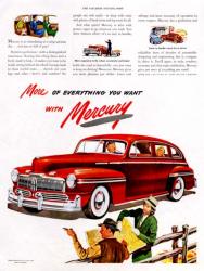 To me, the golden age of automobile ad illustration distortion was the late 1940s and early '50s. Let's start with a 1947 Mercury ad featuring very mild distortion in that the rear of the car appears to be bent outwards slightly.