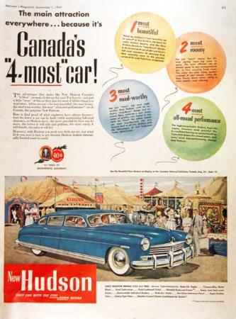Next are two ads for Hudsons. The first ad has a rather flattened 1947 model which was a heavily facelifted body dating back well into the Thirties.