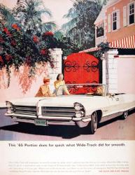 My compliments to Mr. Pittenger. This is the kind of thing I lap up with delight. (Insert image of cat confronted with dish of cream.) As for exaggeratedly wide Pontiac depictions in mid-60s ads, it may not be coincidental that part of the Pontiac image at the time was a motif called "Wide-Track." (May still be. A Google search on "Wide-Track" and variant spellings turned up a number of Pontiac hits.) The '65 front-end styling with stacked, vertical headlights may have been another attempt to exaggerate the car's apparent wideness. Exactly how that translated into actual physical dimensions, I'm not sure, since there are limits on how wide a car can actually be to fit existing garage doors, parking spaces, narrow lanes, and so on.