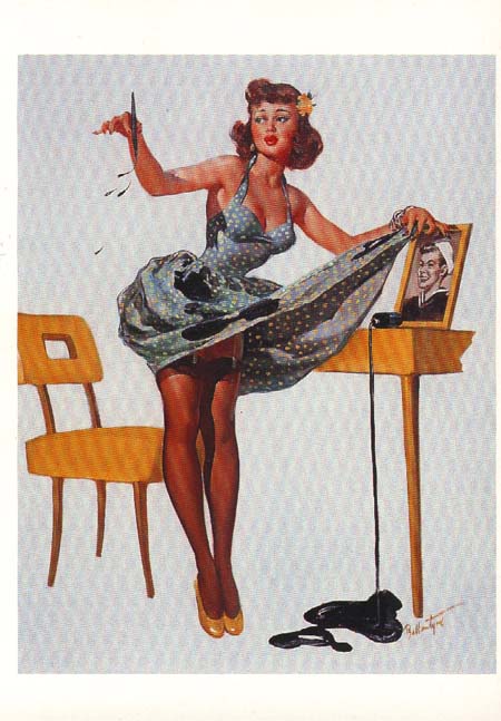 Maybe the fact that pin-up images are usually meant to sit out there, embodying male fantasies means that whatever might be diestinctive or individual about the gal gets kind of airbrushed (even if not literally) over? That's my own prob with much pin-up type art. I have nothing against it and am happy if people get paid and enjoy the turn-on, etc. But it usually feels bland to me -- I look at Playboy, for instance, with no interest at all, because the gals in it (pretty as they are, professionally as they're presented) look like they've already been through the wringer of someone else's imagination. Pre-digested, or something. There's nothing there for my own imagination to get to work on. But maybe all that pre-digesting is what erases any signs of intelligence from the girls. I tend to think there's a real gal back there somewhere -- hopes, dreams, peeves, etc. But I never get a glimpse of her.