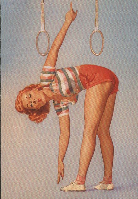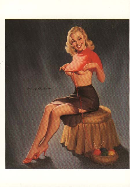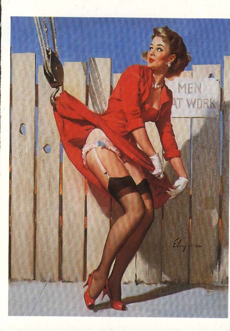Old pinups, it seems, are almost all built around accidents, however farfetched. You just walked in on her in a compromising pose and made her go "Ooooohhh!", or she did something stupid and hiked her skirts while going "Ooooohhh!", or she spilled something, hiked her skirts yet again, and said "Oh fiddle!", or she was just innocently but rather obtusely trying on a sweater or getting dressed. Some of these "accidents" stretch the limits of plausibility, others imply some kind of severe mental deficiency on the female's part, while still others border on assault, but all are built around "normal" babes in normal situations being playfully but accidentally exposed by events. What's more, all the girls/victims seem like they'll be happy about it once the "Ooooohhh!" factor wears off, as though their recent misfortune gives them an excuse to do what they wanted to do anyway. More old pinups here.